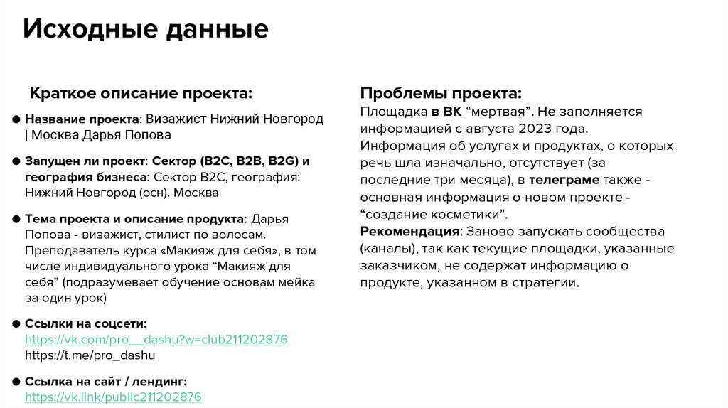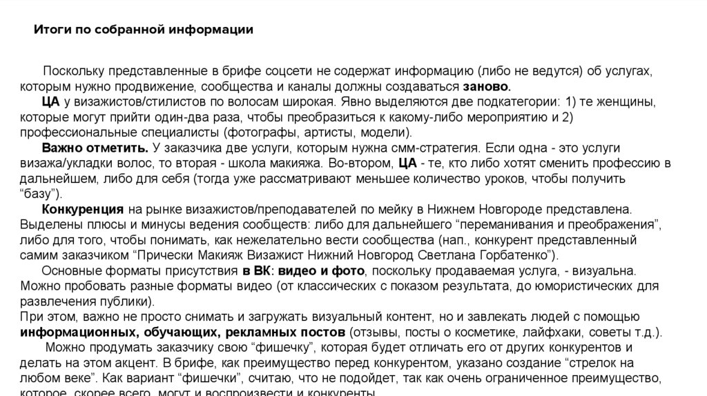 Итоги по собранной информацииПоскольку представленные в брифе соцсети не содержат информацию (либо не ведутся) об услугах,