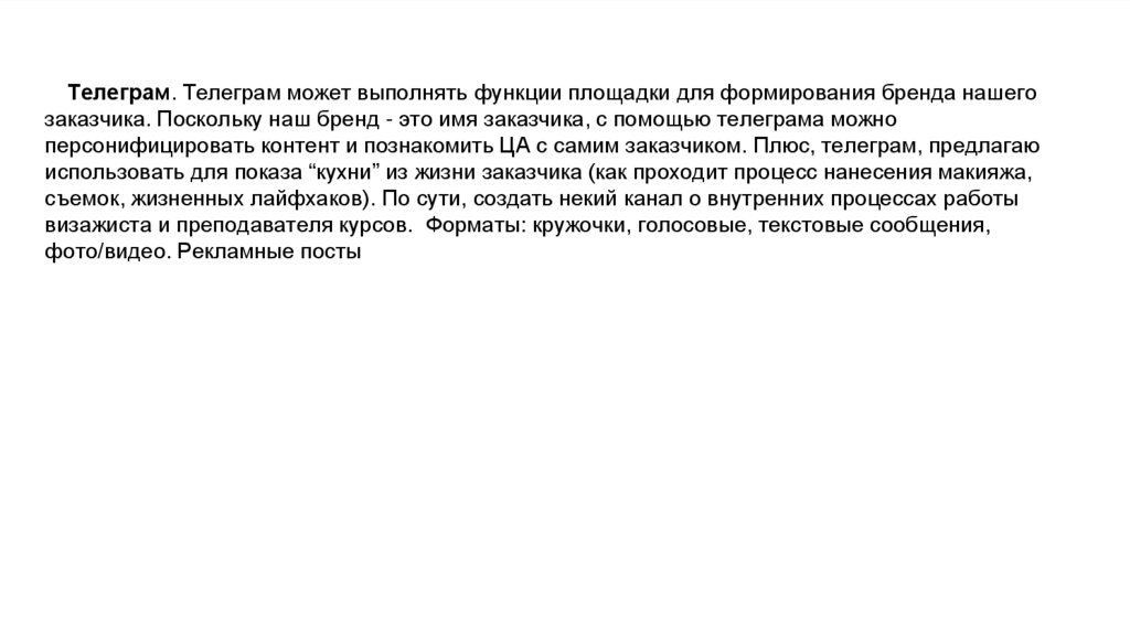 Телеграм. Телеграм может выполнять функции площадки для формирования бренда нашегозаказчика. Поскольку наш бренд - это имя заказчика, с помощью телеграма можно