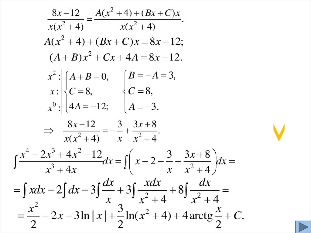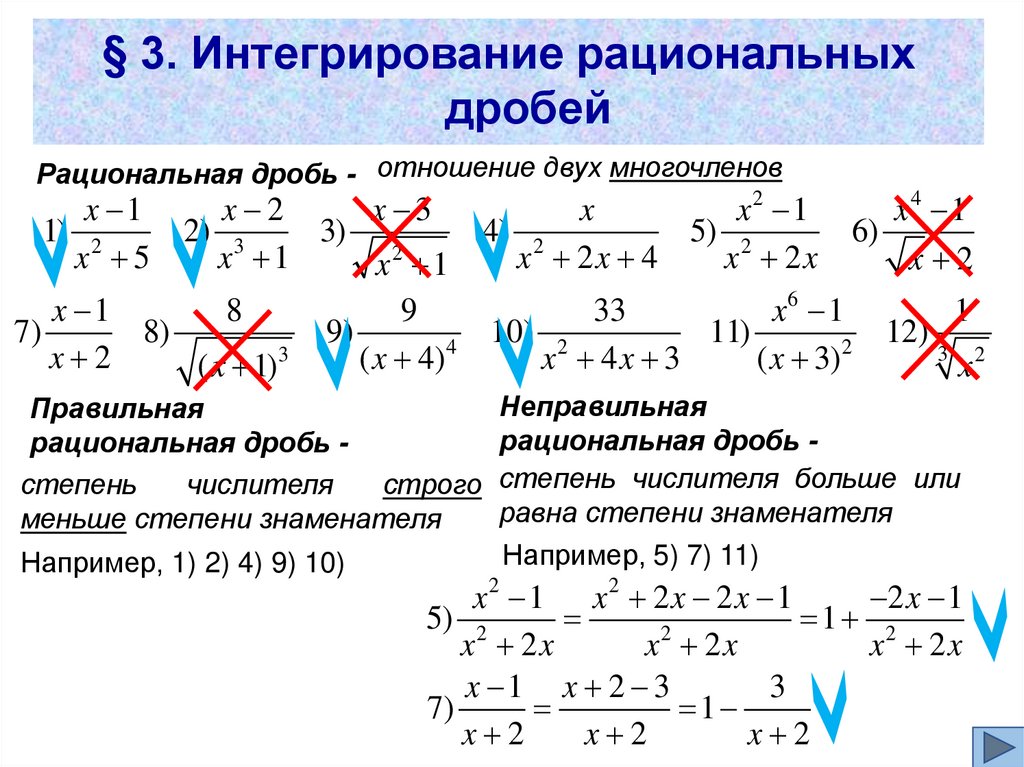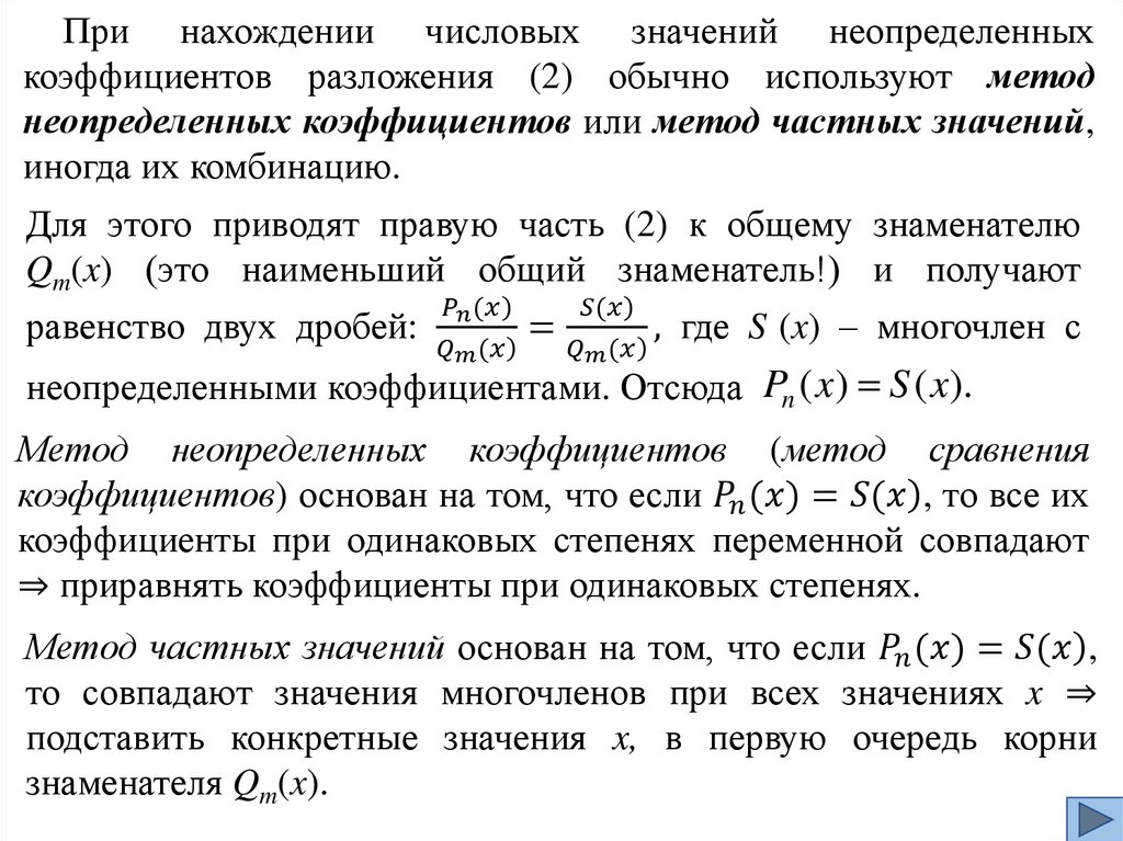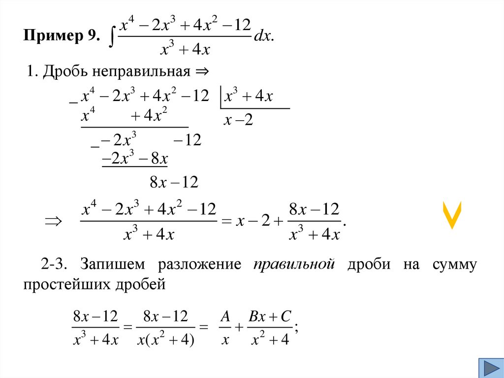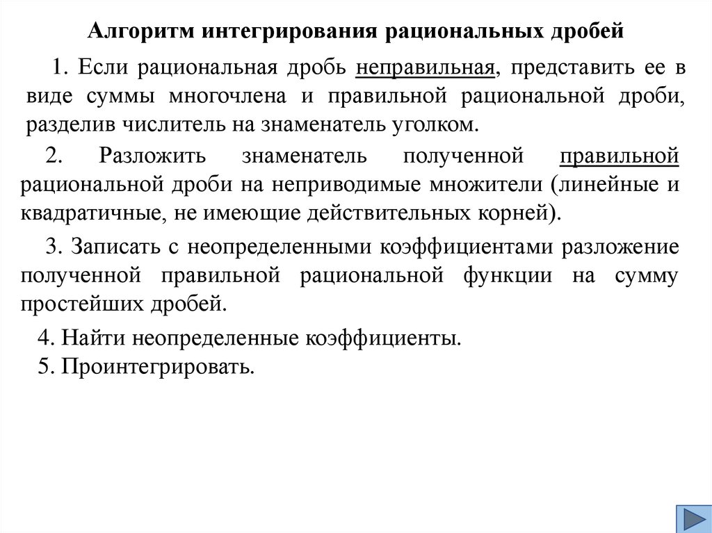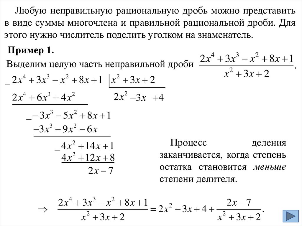 Любую неправильную рациональную дробь можно представитьв виде суммы многочлена и правильной рациональной дроби. Для