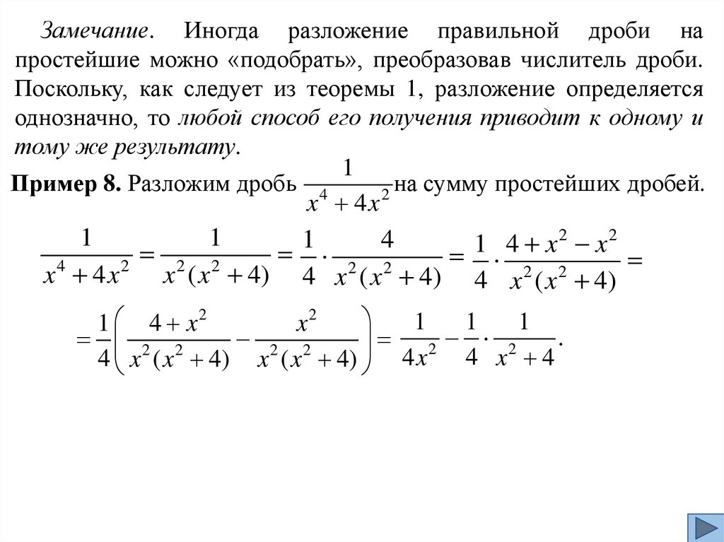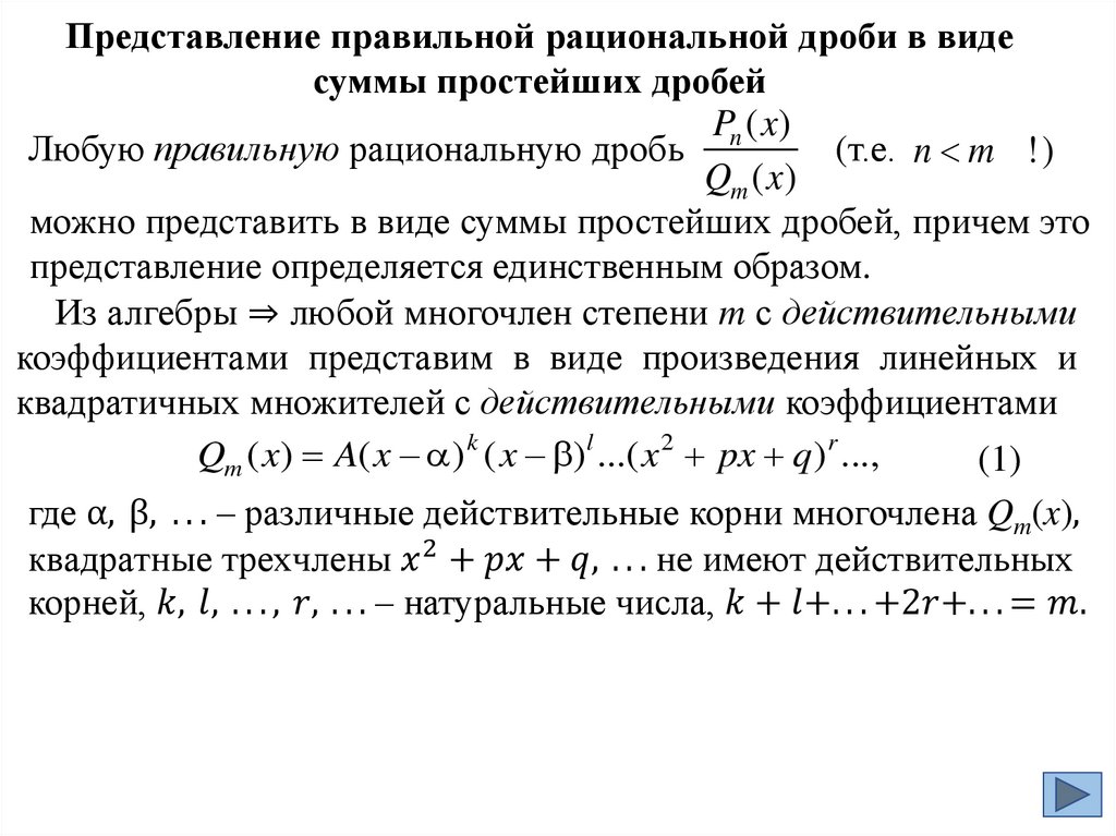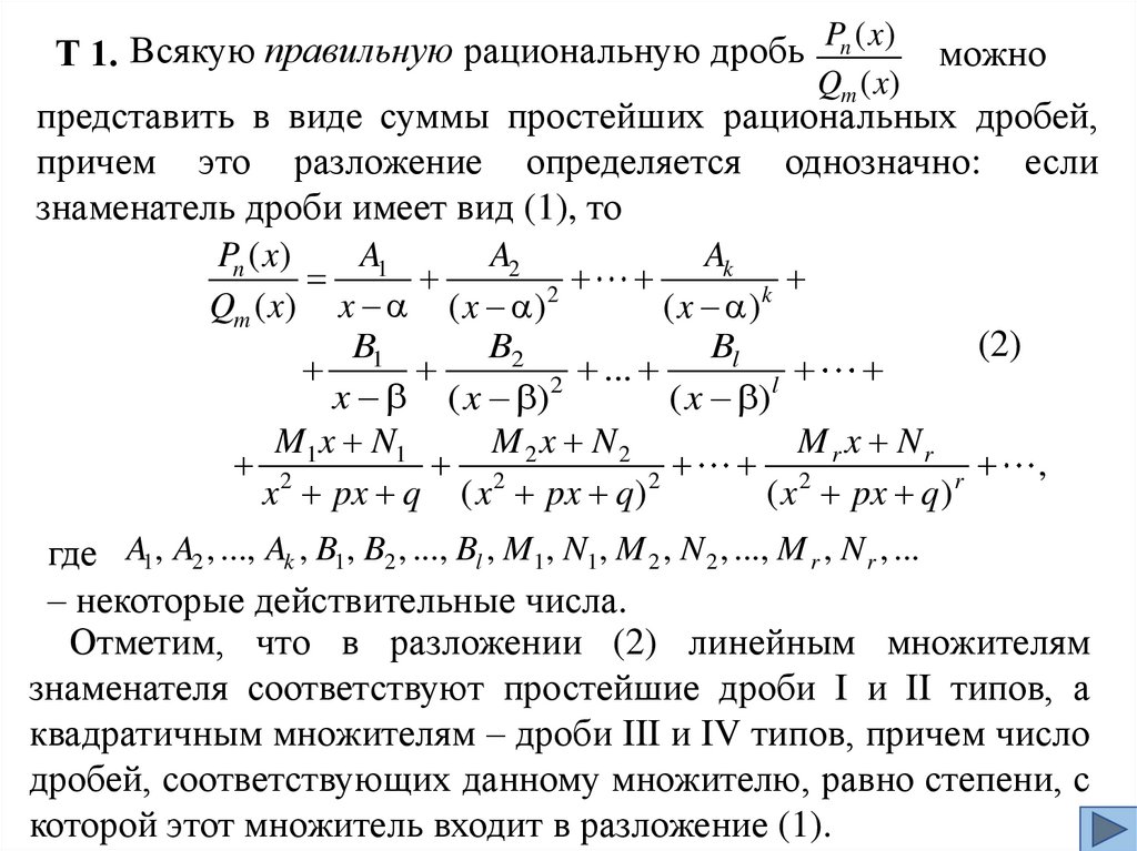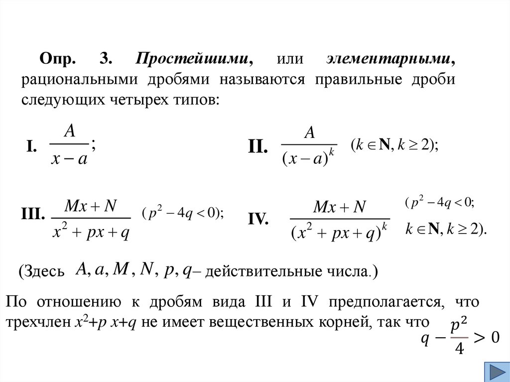 Опр. 3. Простейшими, или элементарными,рациональными дробями называются правильные дроби
