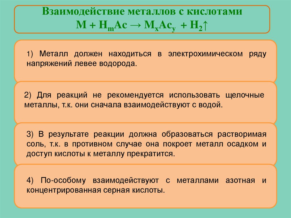 Взаимодействие металлов с кислотамиM + HmAc → MxAcy + H2↑