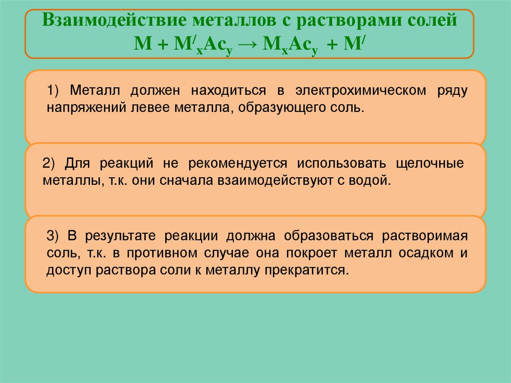 Взаимодействие металлов с растворами солейM + M/xAcy → MxAcy + М/