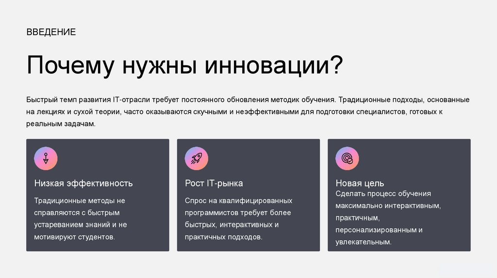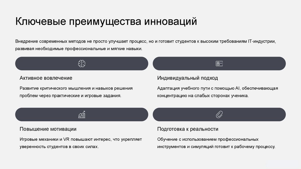 Ключевые преимущества инновацийВнедрение современных методов не просто улучшает процесс, но и готовит студентов к высоким требованиям IT-индустрии,