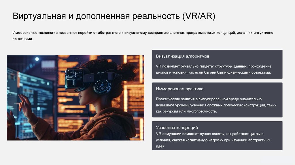 Виртуальная и дополненная реальность (VR/AR)Иммерсивные технологии позволяют перейти от абстрактного к визуальному восприятию сложных программистских концепций, делая их интуитивно