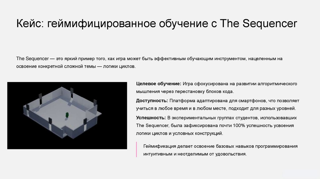 Кейс: геймифицированное обучение с The SequencerThe Sequencer — это яркий пример того, как игра может быть эффективным обучающим инструментом, нацеленным на