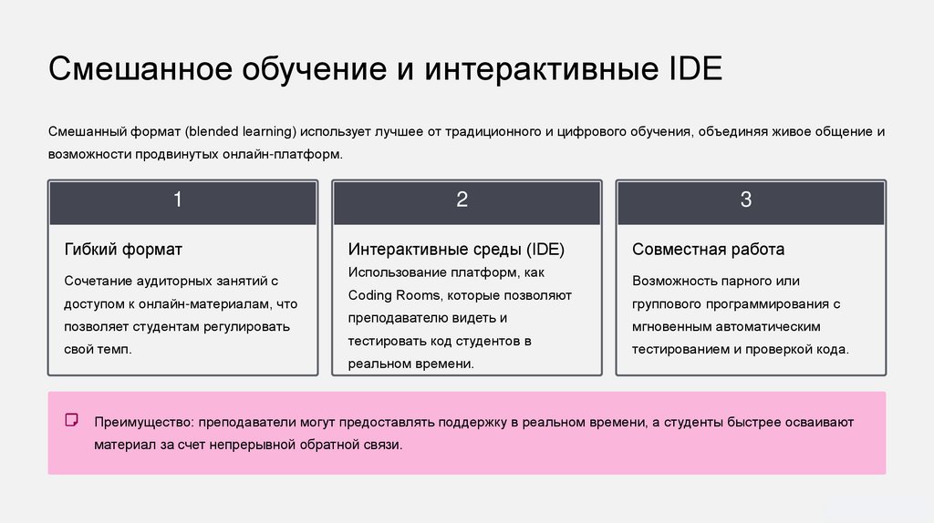 Преимущество: преподаватели могут предоставлять поддержку в реальном времени, а студенты быстрее осваивают
