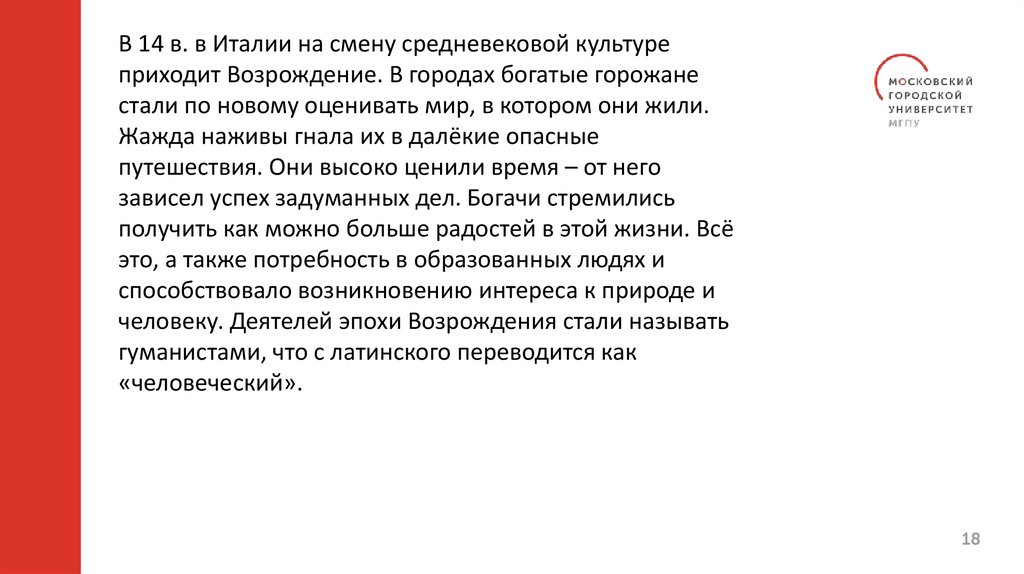 В 14 в. в Италии на смену средневековой культуреприходит Возрождение. В городах богатые горожане