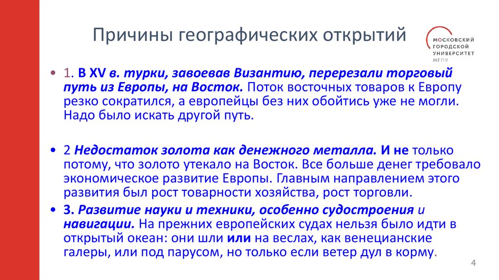 Причины географических открытий• 1. В XV в. турки, завоевав Византию, перерезали торговый