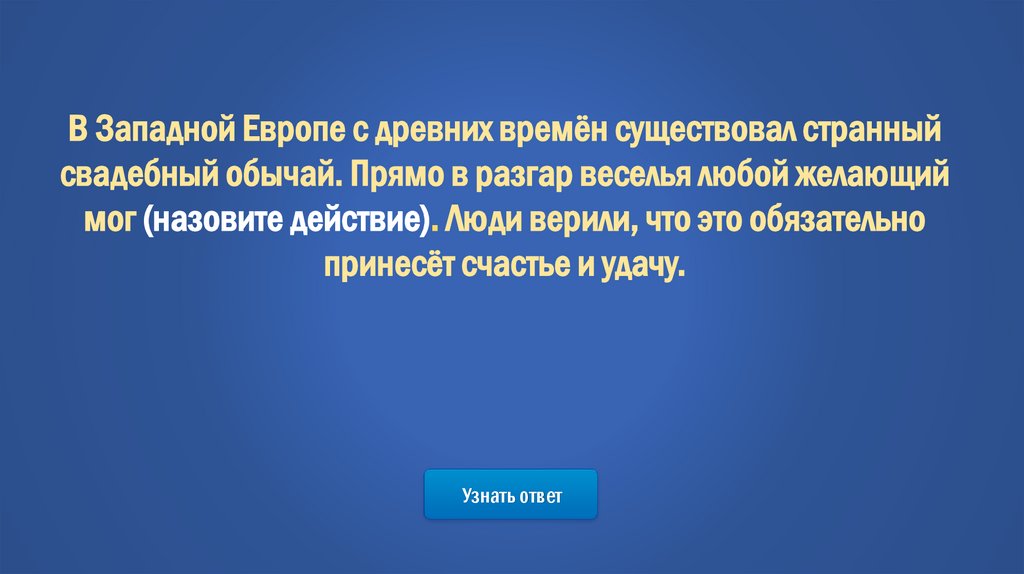 В Западной Европе с древних времён существовал странныйсвадебный обычай. Прямо в разгар веселья любой желающий