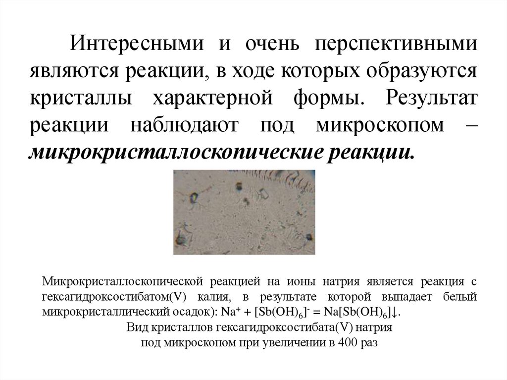 микрокристаллический осадок): Na+ + [Sb(OH)6]- = Na[Sb(OH)6]↓.