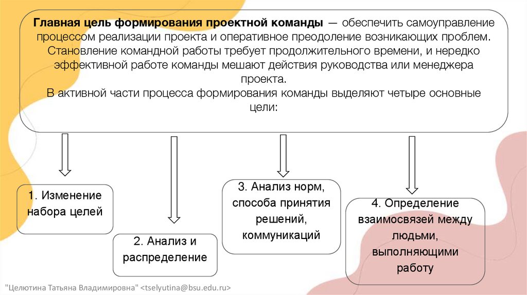 Главная цель формирования проектной команды — обеспечить самоуправлениепроцессом реализации проекта и оперативное преодоление возникающих проблем.