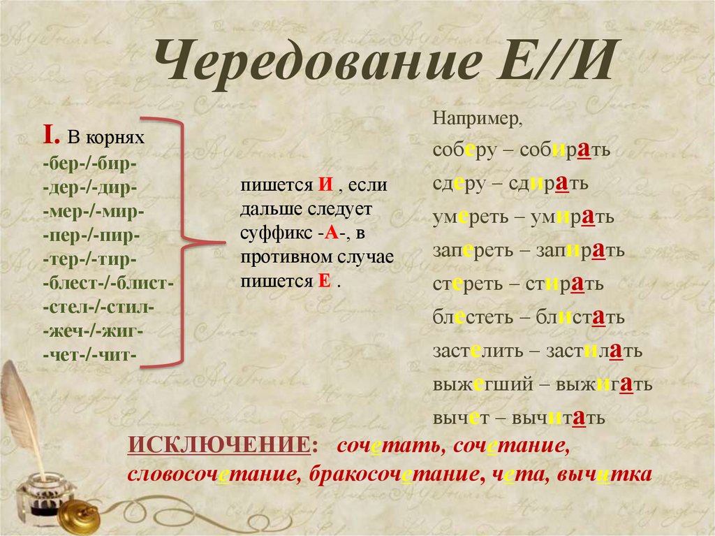 -бер-/-бир-дер-/-дир-мер-/-мир-пер-/-пир-тер-/-тир-блест-/-блист-стел-/-стил-жеч-/-жиг-чет-/-чит-