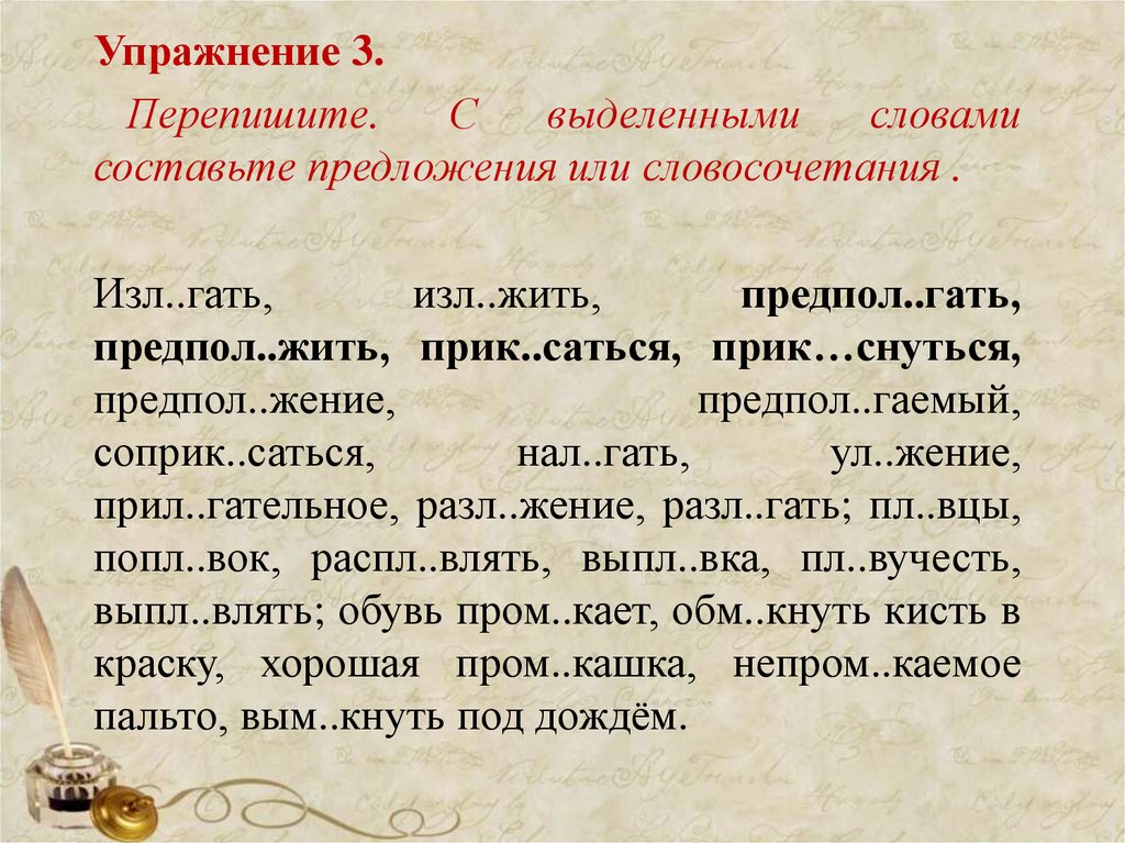 прил..гательное, разл..жение, разл..гать; пл..вцы,