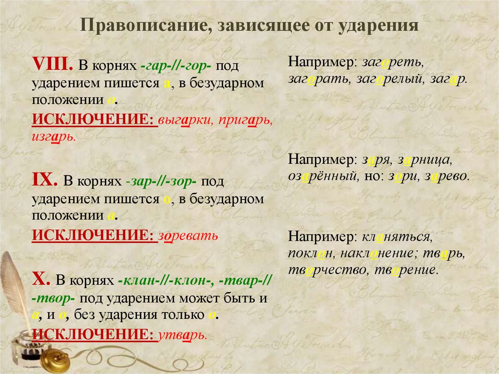 Правописание, зависящее от ударенияVIII. В корнях -гар-//-гор- под