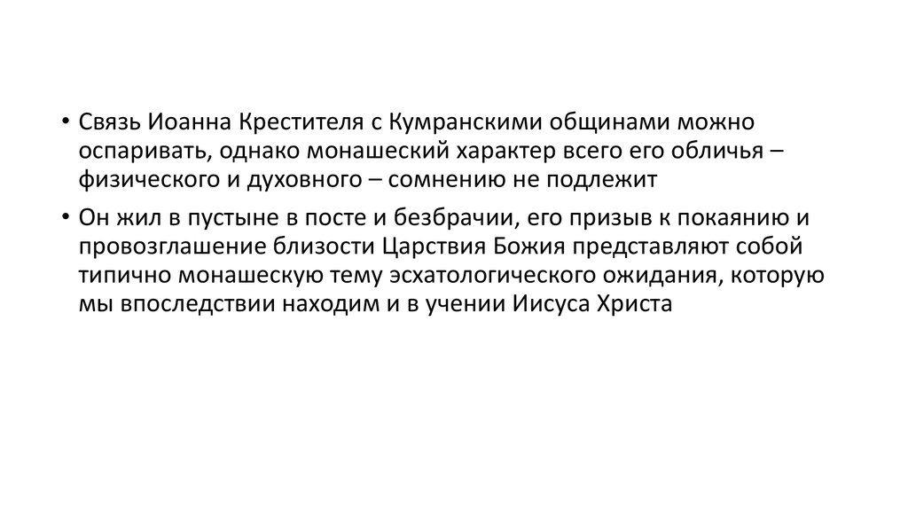 • Связь Иоанна Крестителя с Кумранскими общинами можнооспаривать, однако монашеский характер всего его обличья –