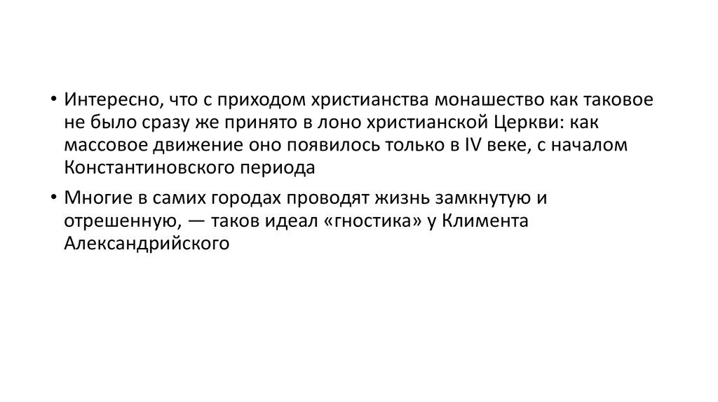 • Интересно, что с приходом христианства монашество как таковоене было сразу же принято в лоно христианской Церкви: как