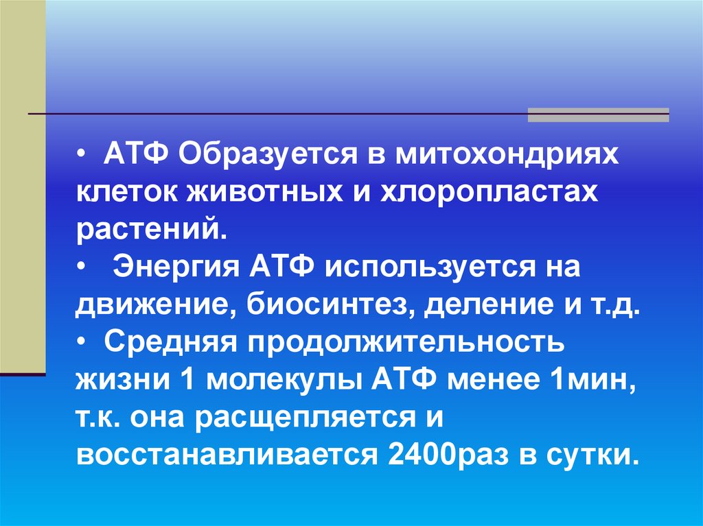 • АТФ Образуется в митохондрияхклеток животных и хлоропластах