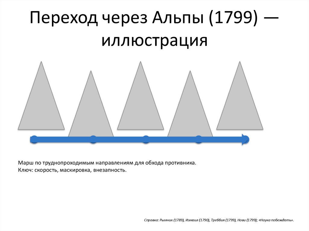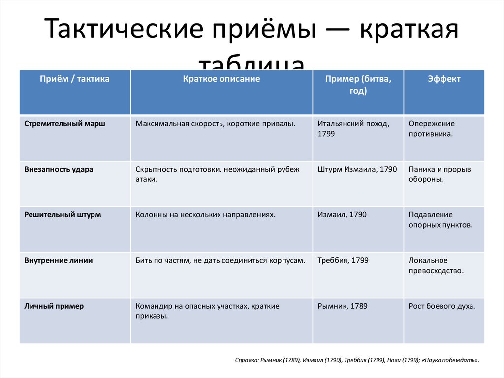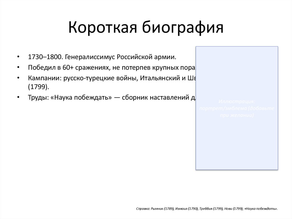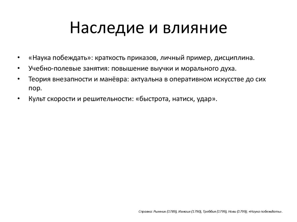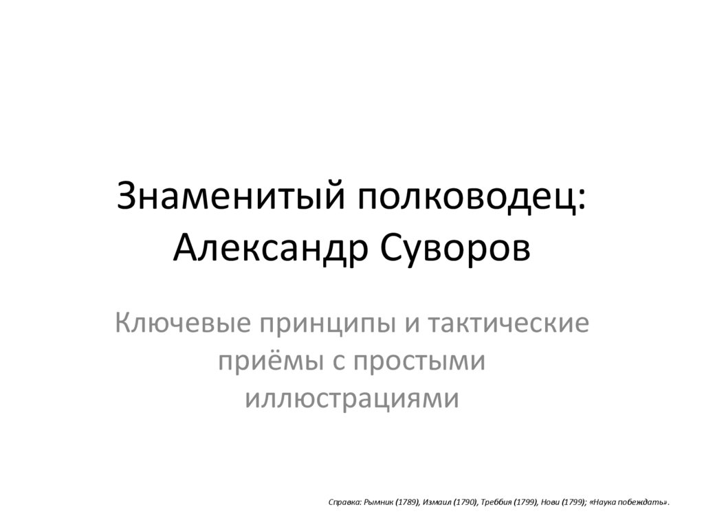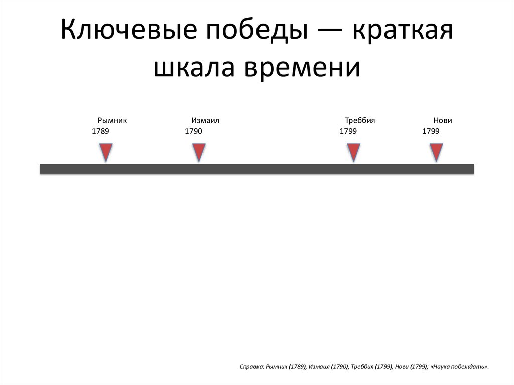 Справка: Рымник (1789), Измаил (1790), Треббия (1799), Нови (1799); «Наука побеждать».