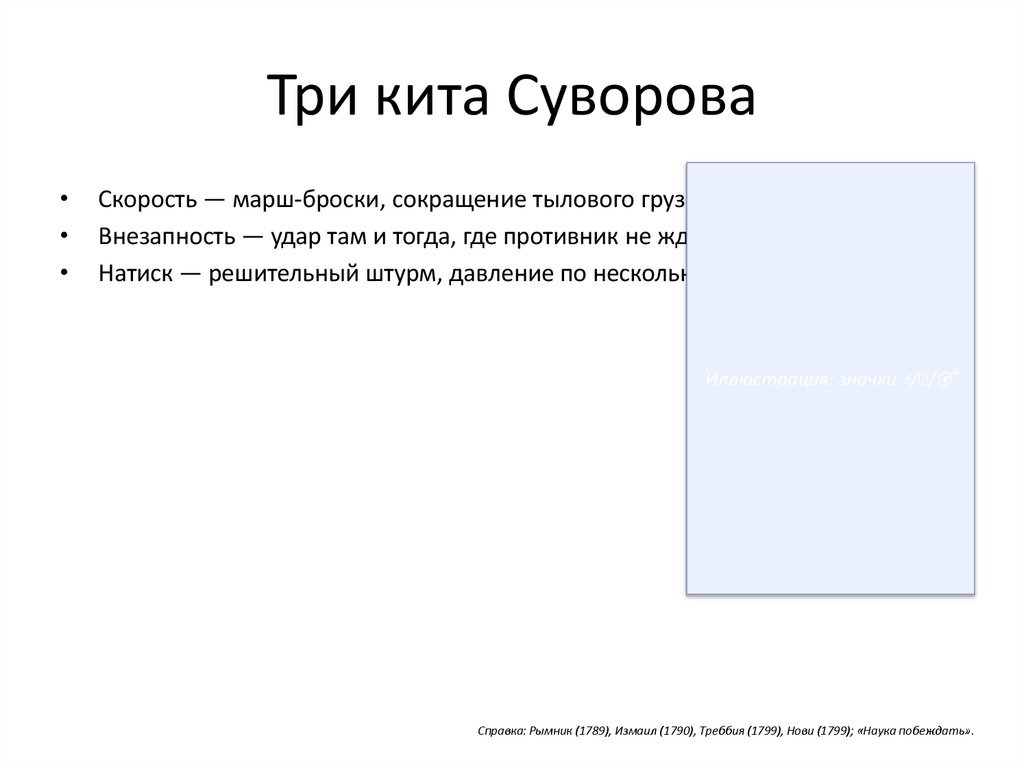 Три кита СувороваСкорость — марш-броски, сокращение тылового груза.