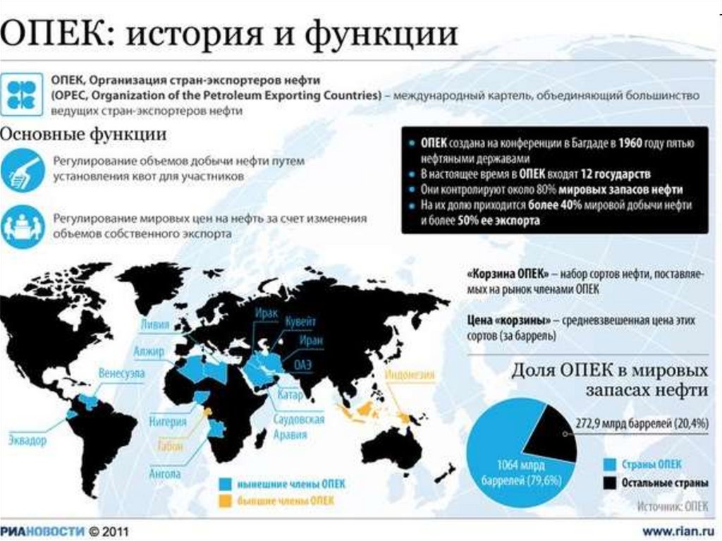 В настоящее время в ОПЕК входит 13 стран-участниц:Алжир, Ливия, Нигерия, Ангола, Конго, Экваториальная