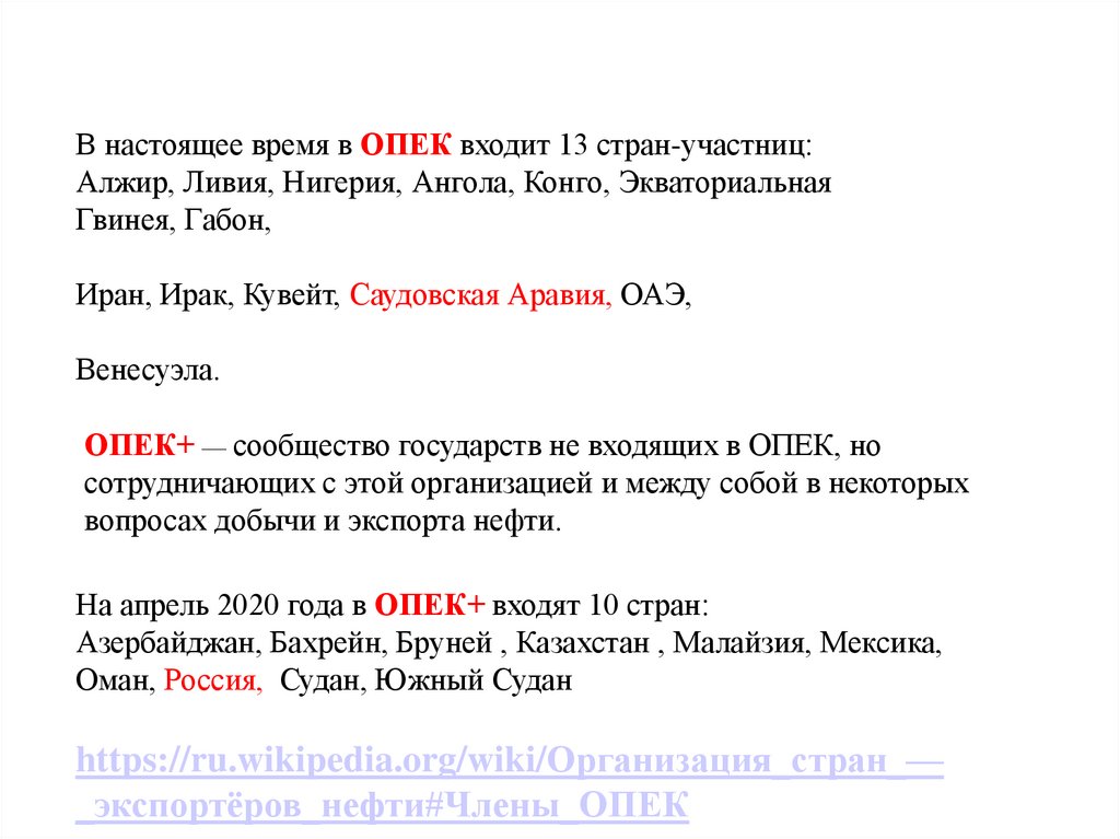 На апрель 2020 года в ОПЕК+ входят 10 стран: