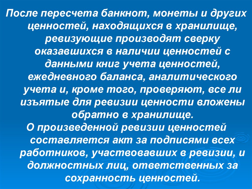 После пересчета банкнот, монеты и другихценностей, находящихся в хранилище,