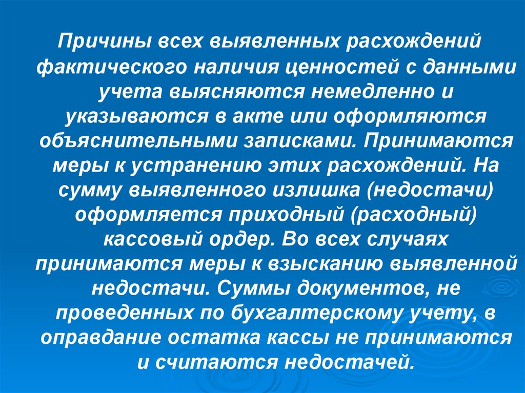 Причины всех выявленных расхожденийфактического наличия ценностей с данными