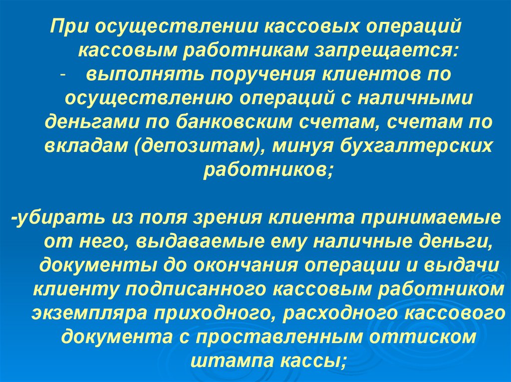 При осуществлении кассовых операцийкассовым работникам запрещается: