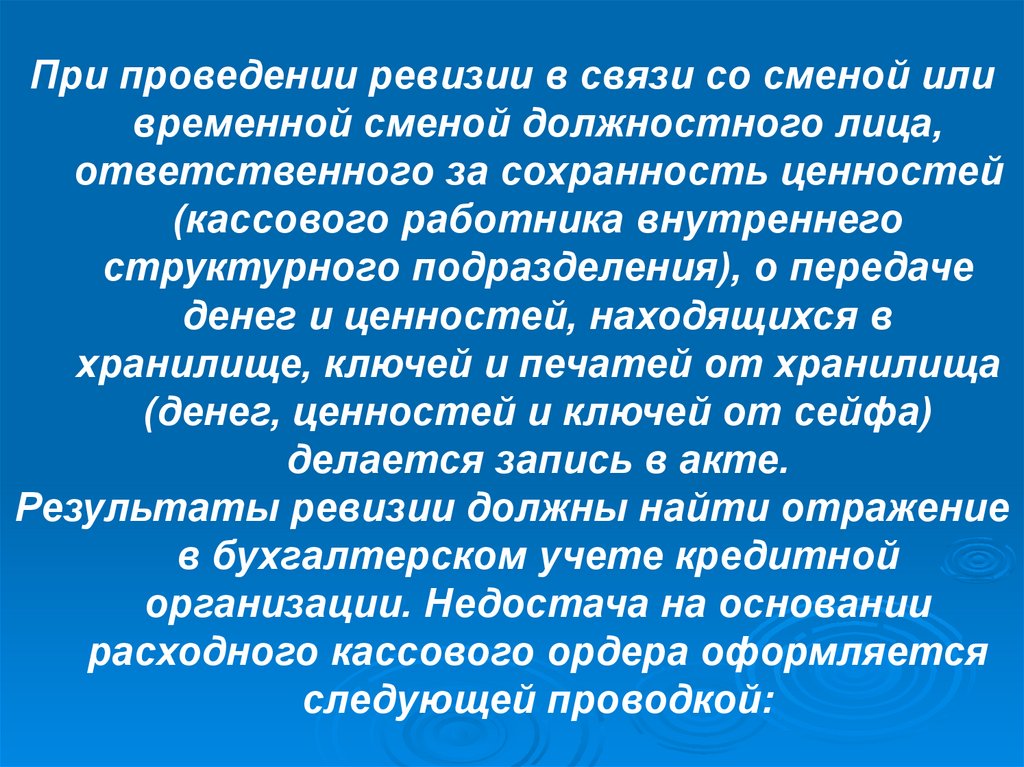 При проведении ревизии в связи со сменой иливременной сменой должностного лица,