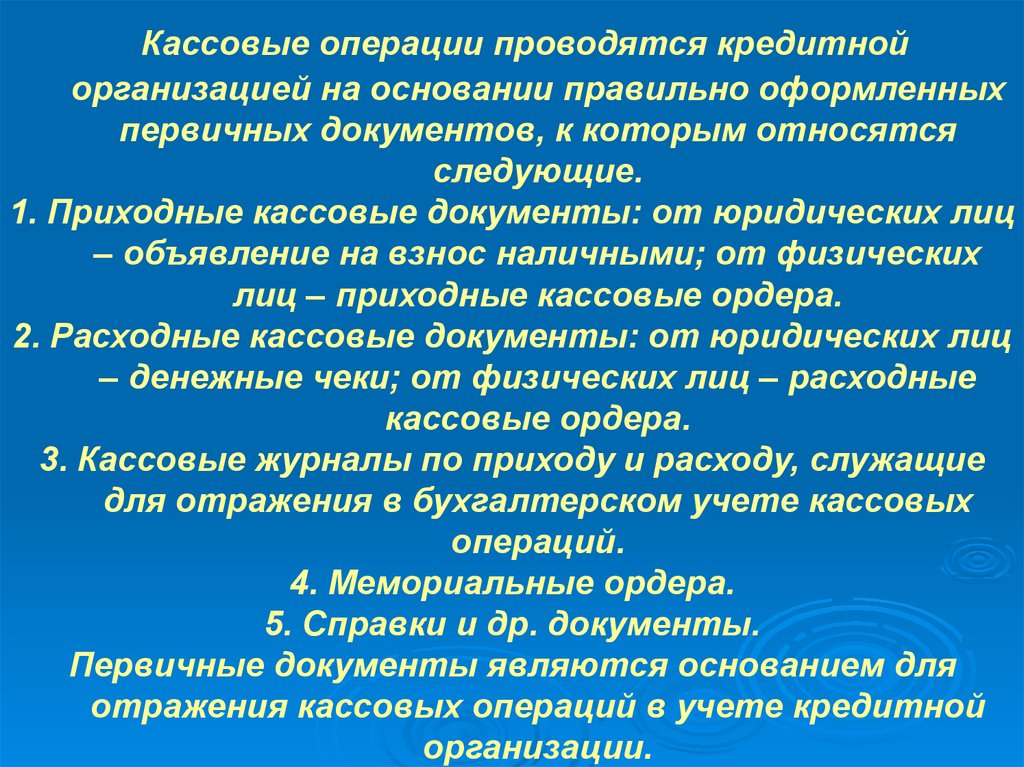 Кассовые операции проводятся кредитнойорганизацией на основании правильно оформленных