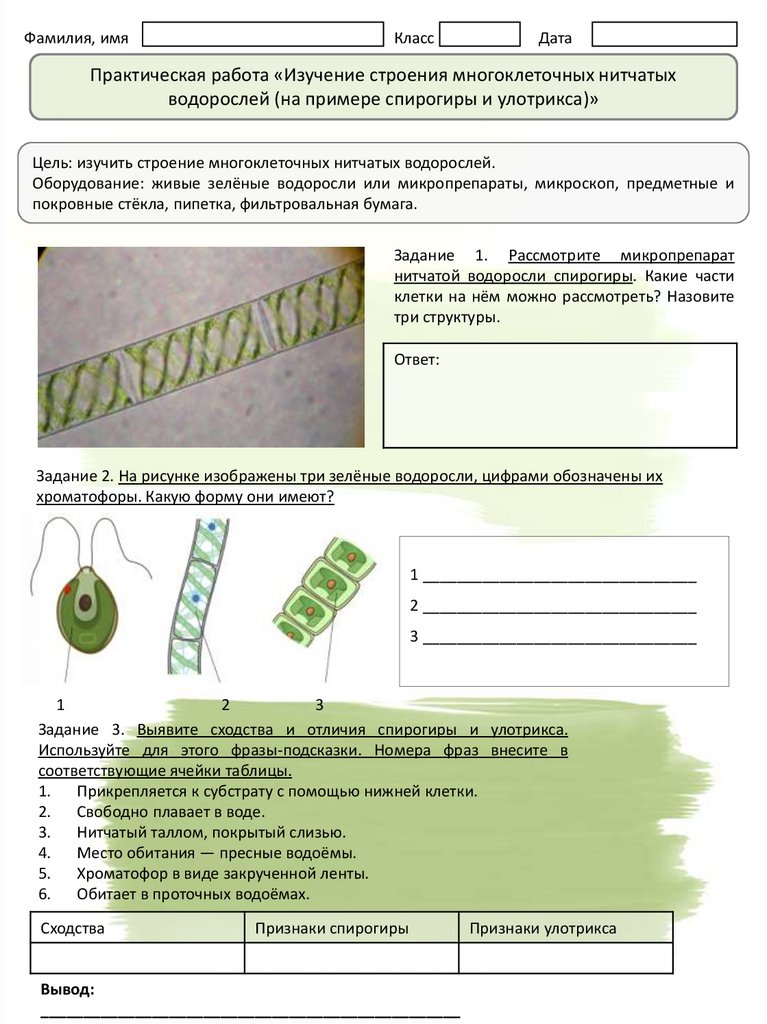Задание 3. Выявите сходства и отличия спирогиры и улотрикса.