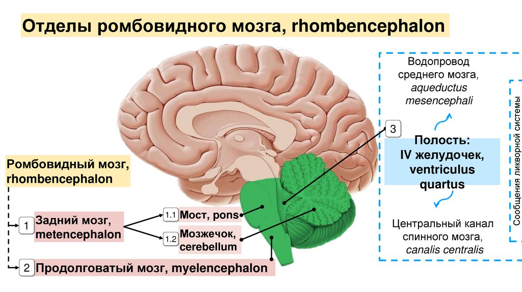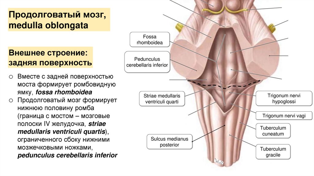 • Ромбовидный мозг: продолговатый мозг, его внешнее и внутреннее