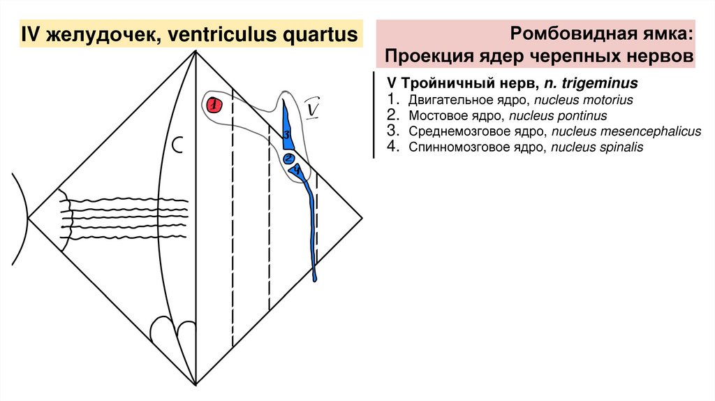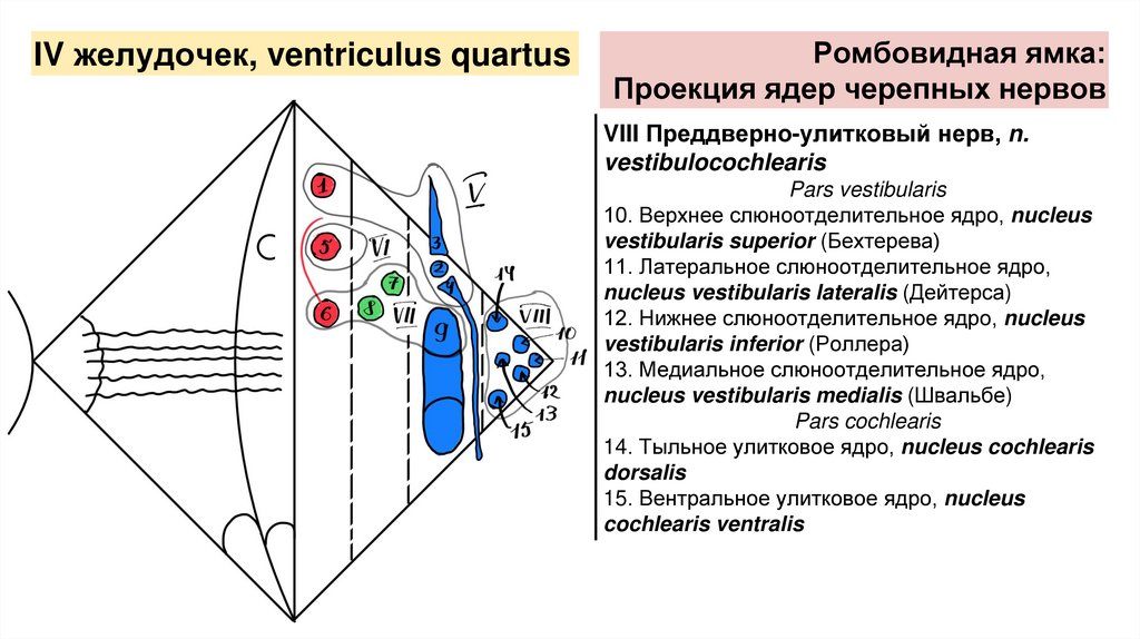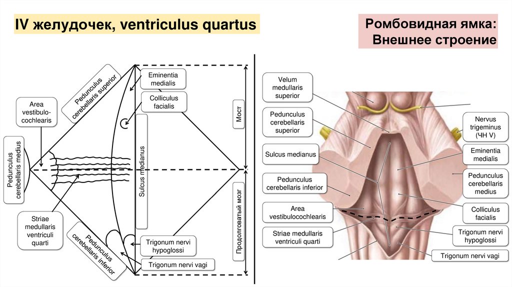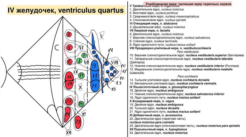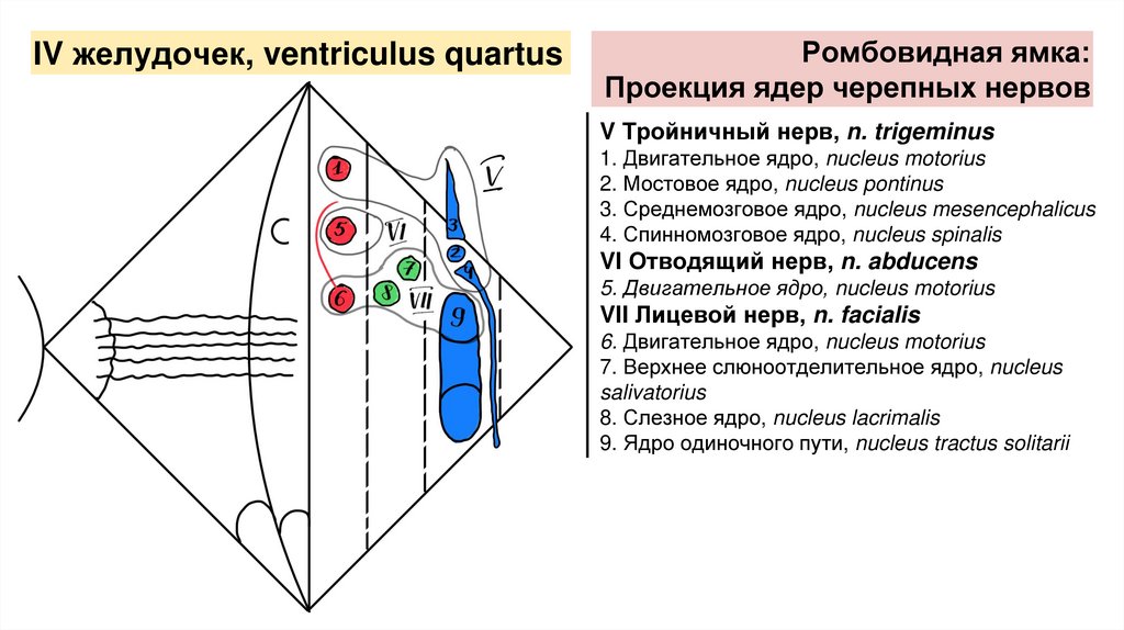 Ромбовидная ямка: проекция ядер черепных нервовIV желудочек, ventriculus quartus