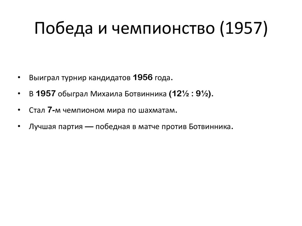 • В 1957 обыграл Михаила Ботвинника (12½ : 9½).