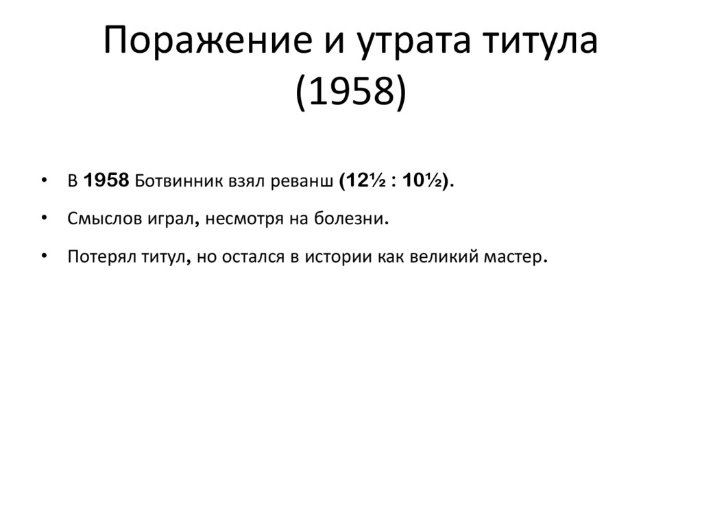 • В 1958 Ботвинник взял реванш (12½ : 10½).