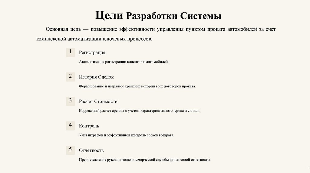 Цели Разработки СистемыОсновная цель — повышение эффективности управления пунктом проката автомобилей за счет