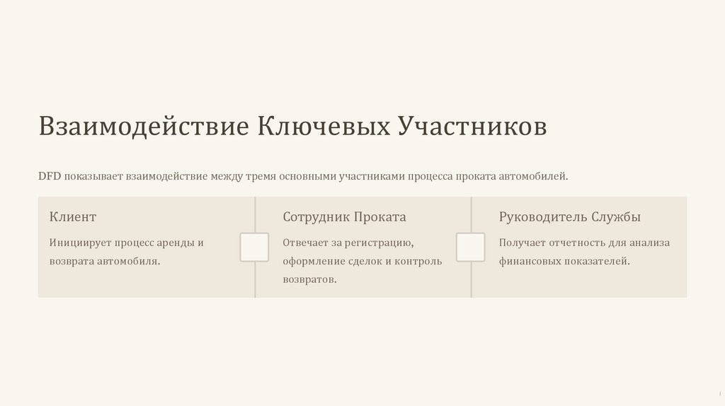 Взаимодействие Ключевых УчастниковDFD показывает взаимодействие между тремя основными участниками процесса проката автомобилей.