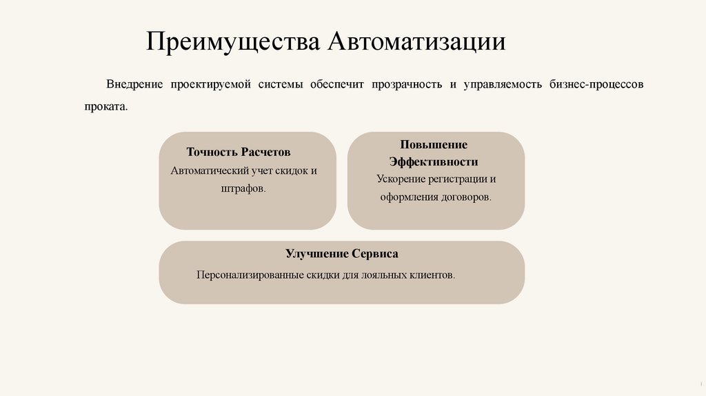 Преимущества АвтоматизацииВнедрение проектируемой системы обеспечит прозрачность и управляемость бизнес-процессов