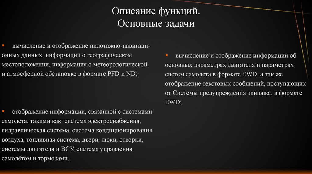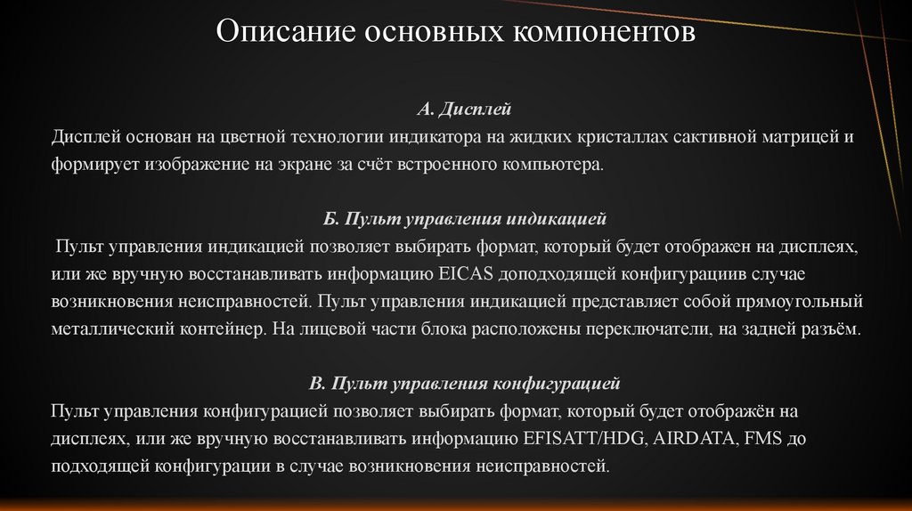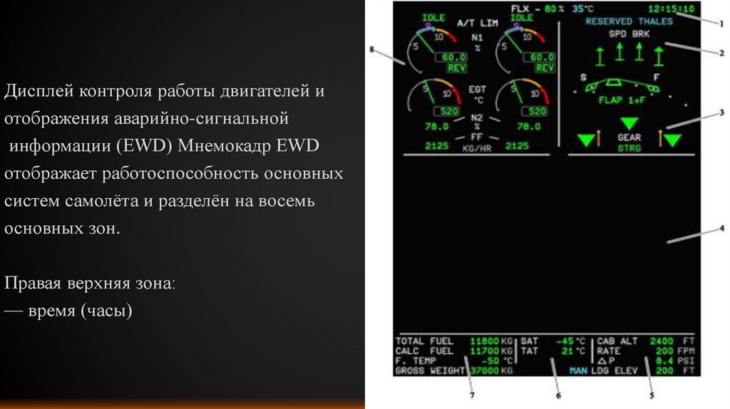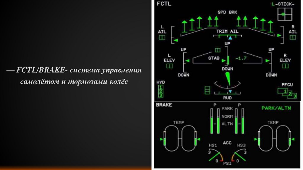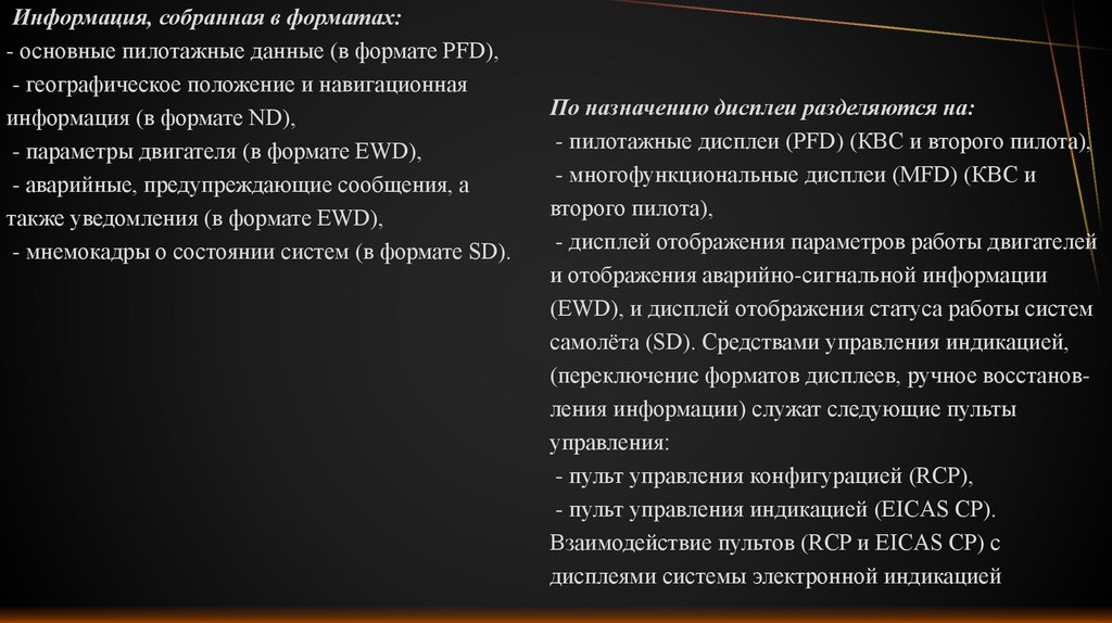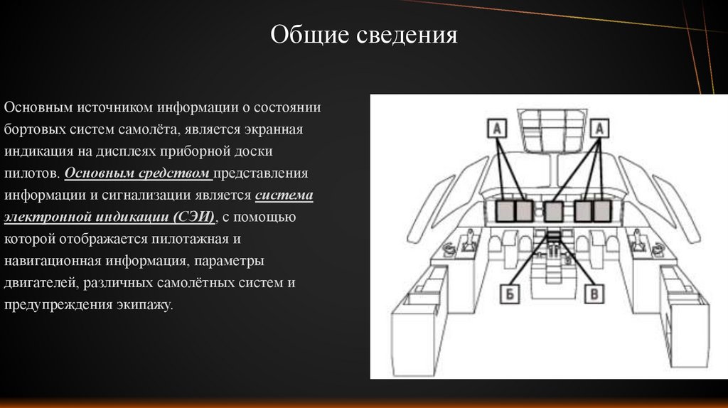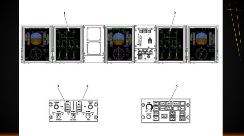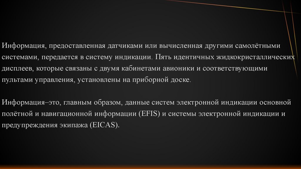 Информация, предоставленная датчиками или вычисленная другими самолётнымисистемами, передается в систему индикации. Пять идентичных жидкокристаллических
