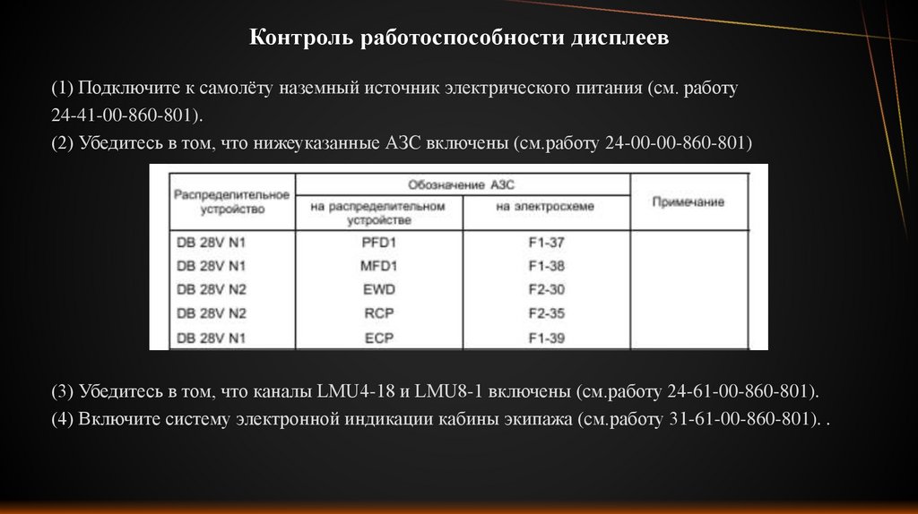 Контроль работоспособности дисплеев(1) Подключите к самолёту наземный источник электрического питания (см. работу