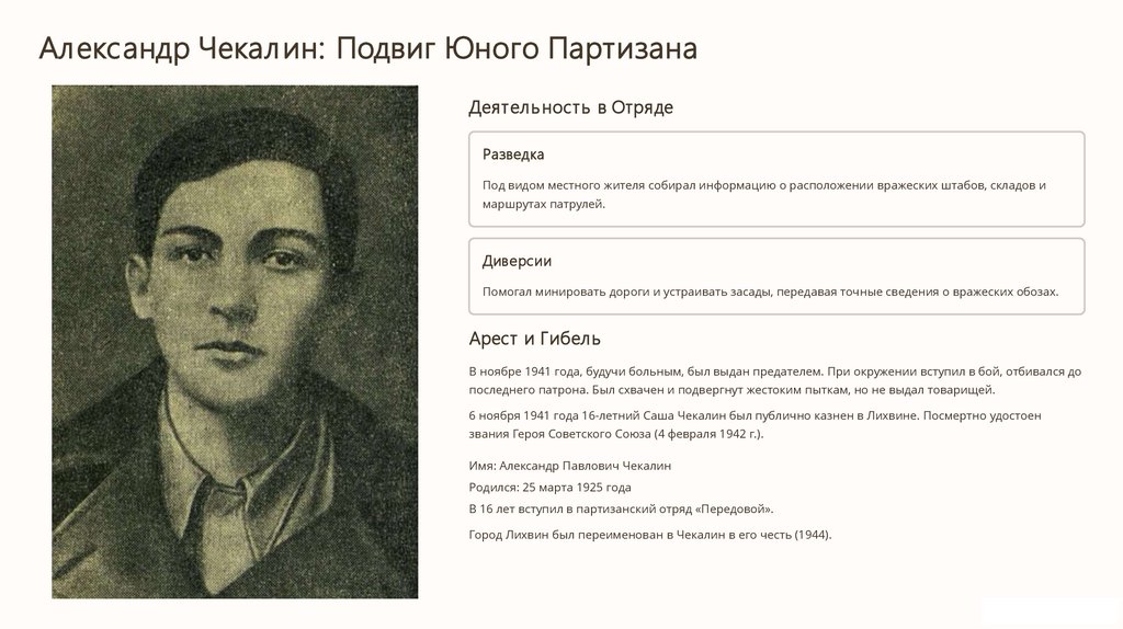 Алекс андр Чекал ин: Подвиг Юного ПартизанаДеятел ь ность в Отряде