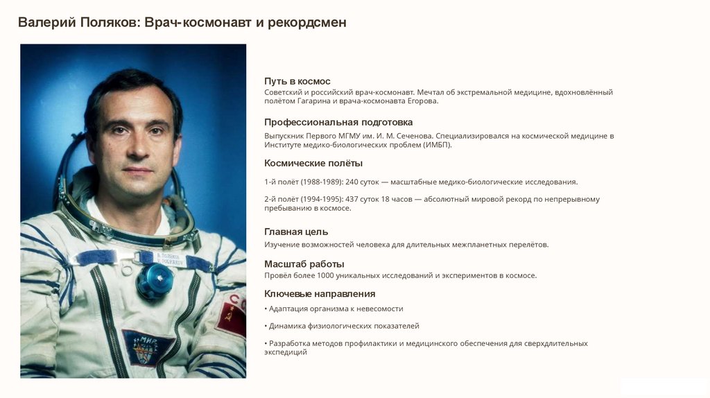 Советский и российский врач-космонавт. Мечтал об экстремальной медицине, вдохновлённый