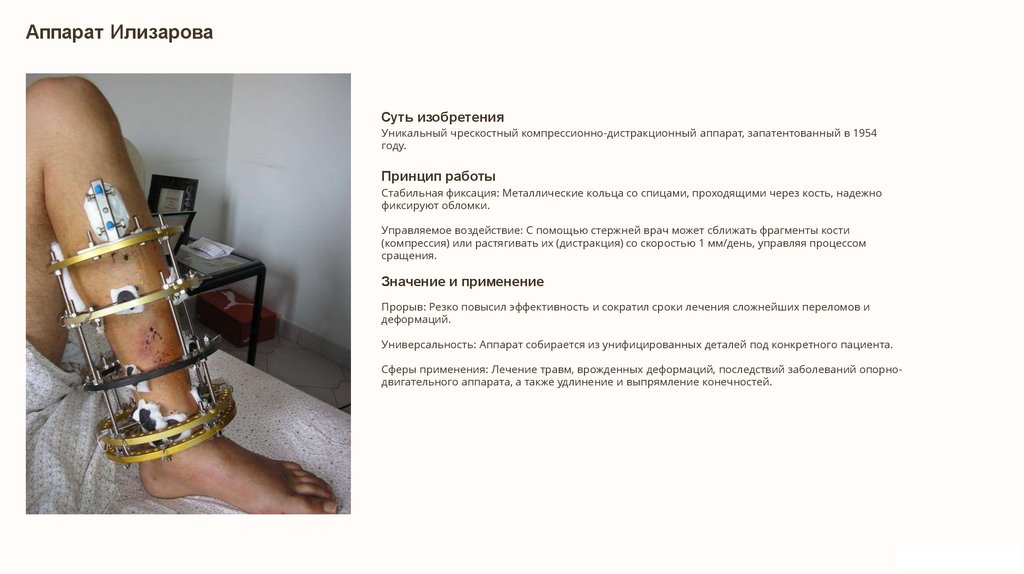 Сферы применения: Лечение травм, врожденных деформаций, последствий заболеваний опорнодвигательного аппарата, а также удлинение и выпрямление конечностей.