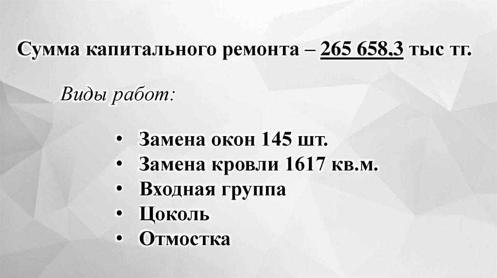 Сумма капитального ремонта – 265 658,3 тыс тг.Виды работ: