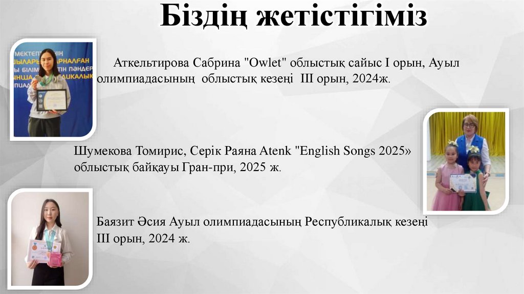 Біздің жетістігімізАткельтирова Сабрина "Owlet" облыстық сайыс І орын, Ауыл