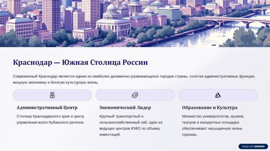Краснодар — Южная Столица РоссииСовременный Краснодар является одним из наиболее динамично развивающихся городов страны, сочетая административные функции,