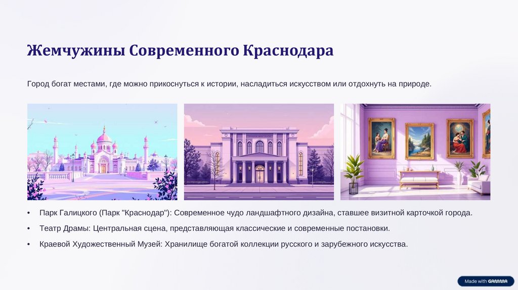 Жемчужины Современного КраснодараГород богат местами, где можно прикоснуться к истории, насладиться искусством или отдохнуть на природе.