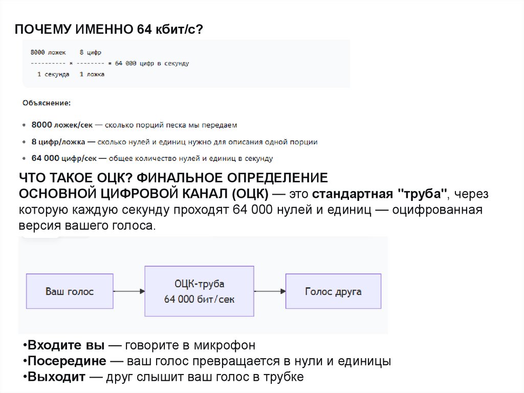 • Расчет: 8000 отсчетов/с × 8 бит/отсчет = 64 000 бит/с = 64 кбит/с.