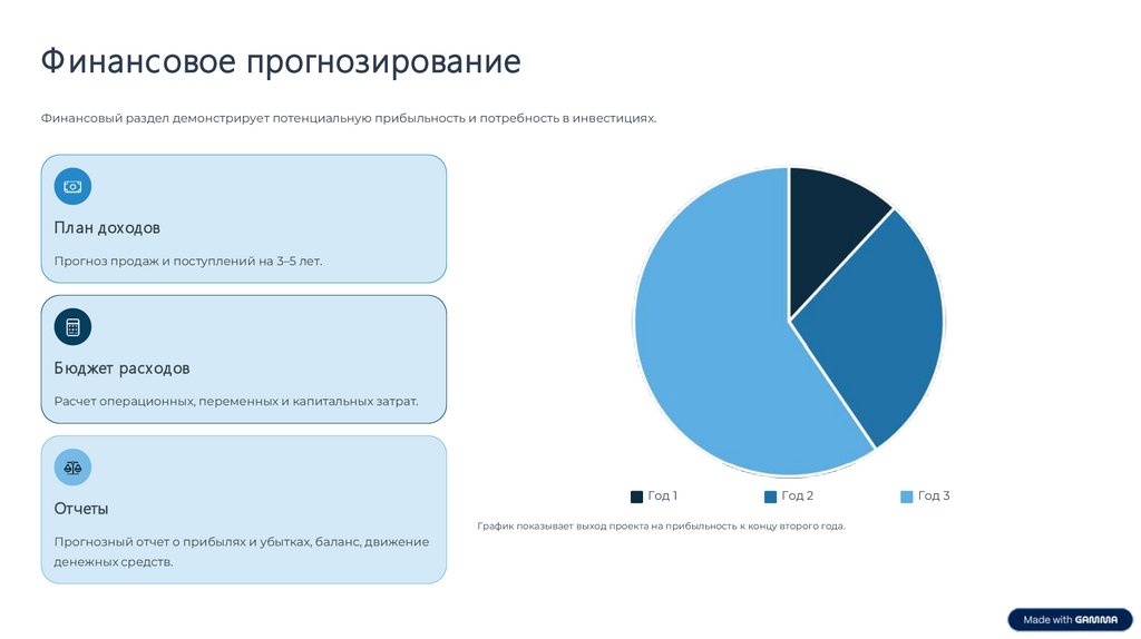 Ф инансовое прогнозированиеФинансовый раздел демонстрирует потенциальную прибыльность и потребность в инвестициях.