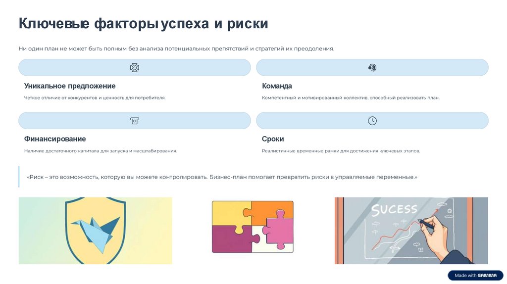 Ключевые факторы успеха и рискиНи один план не может быть полным без анализа потенциальных препятствий и стратегий их преодоления.